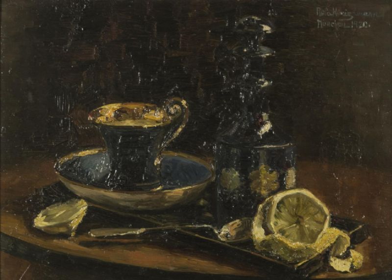 still life with tea cup and decanter
