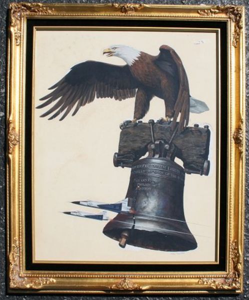 | Illustration depicting the American Bald Eagle, Pass & Stow Liberty Bell & 2 American fighter jets | |