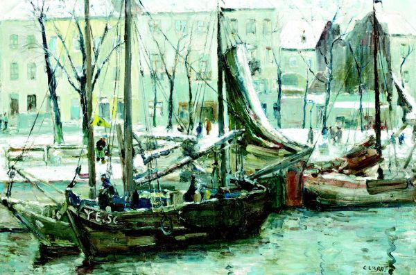 Vissersboten aan winterse kade