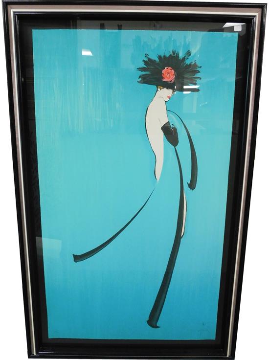 | Depicts elegant woman in fade-away blue dress and black feathered hat | |