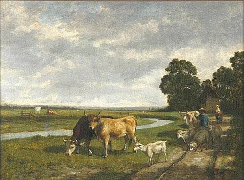 Weite Wiesenlandschaft, im Vordergrund Hirten mit Rindern und Schafen