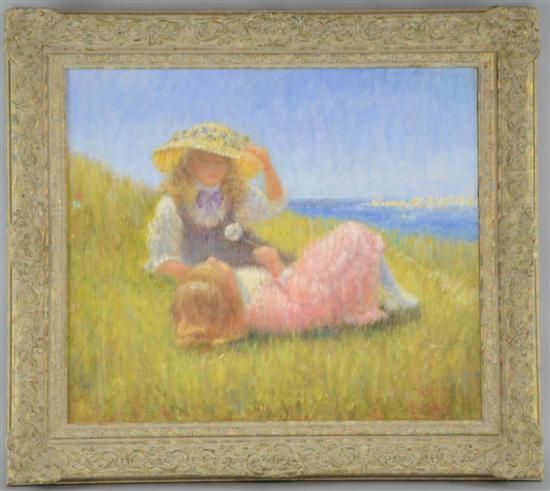 two girls with a dandelion clock overlooking the sea