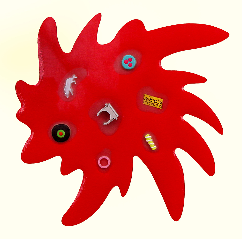 | Resin objects, screen printing color, paper, wood on hardboard | |