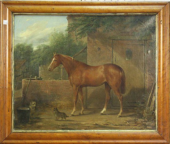 Study of a Chestnut Horse standing outside a Stable near Two Terriers