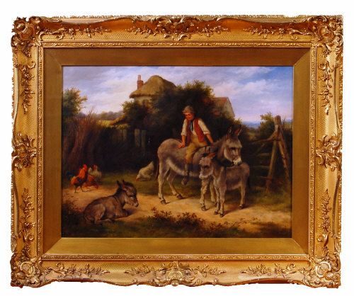 Boy on a donkey with foals and farmyard poultry
