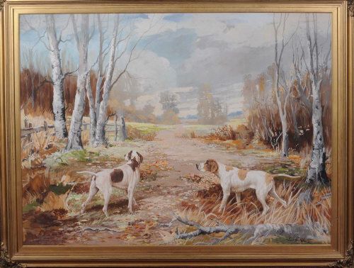 A WOODLAND LANDSCAPE WITH TWO POINTERS