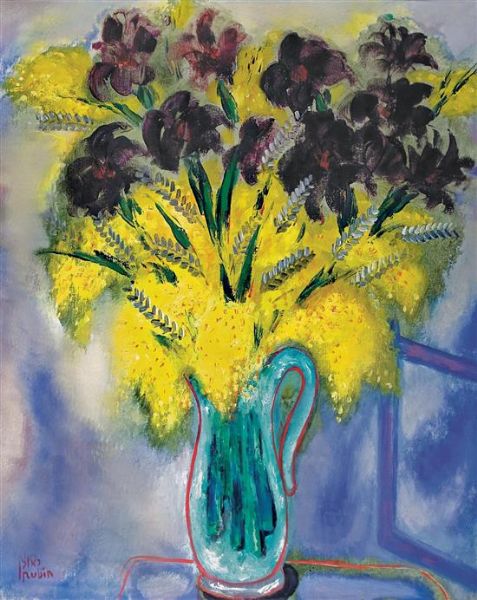 Mimosas and black irises
