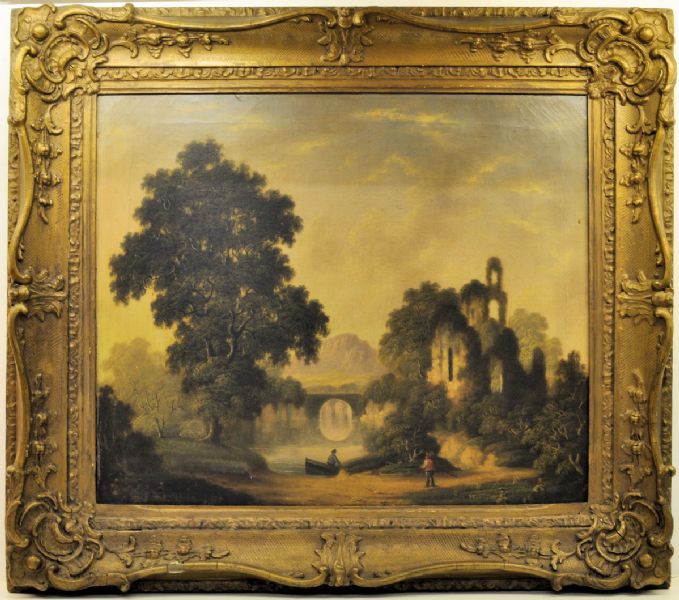 river landscape with figures in a boat and abbey ruins