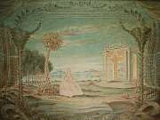| Exotic garden landscape, with lady in elegant 18th century style costume stood before a gazebo and palm tree, with lake and hill | |