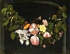 | STILL LIFE OF FLOWERS WITH A BRANCH OF LOGANBERRIES, A BUTTERLY AND A DRAGONFLY | |
