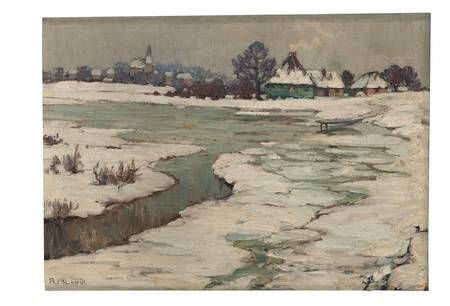 | Winterlandschaft mit zugefrorenem Teich, ein Kirchdorf im Hintergrund. | |