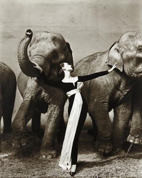 | Dovima with elephants, Evening dress by Dior, Cirque d'Hiver, Paris, August | |