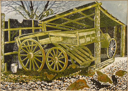 FARM CARTS AND CHICKENS IN A LEAN-TO