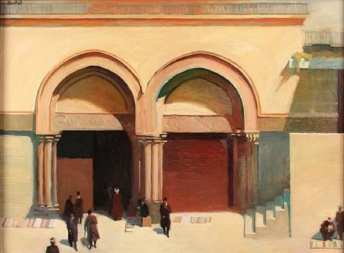Figures outside a building facade