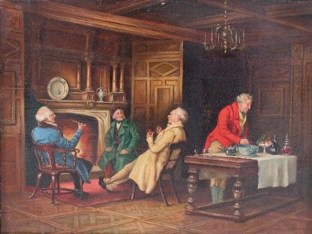 | Old Friends at Home, gentleman drinking beside a fireplace in an oak panelled room | |