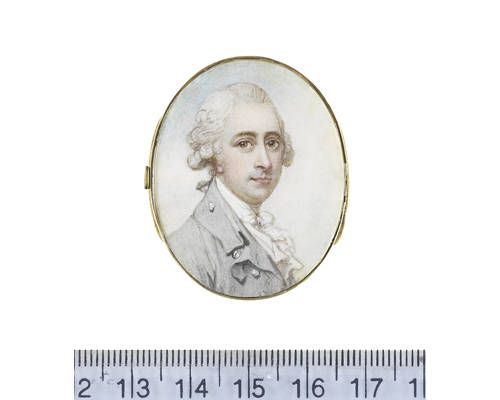| A Gentleman, wearing duck egg blue coat, white waistcoat, frilled chemise, stock and cravat, his powdered hair worn en queue and | |