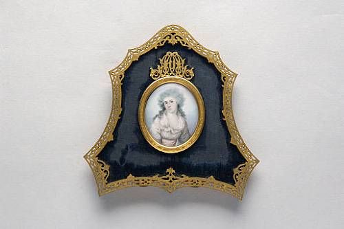 A miniature portrait of a lady in a white dress and having grey curling hair