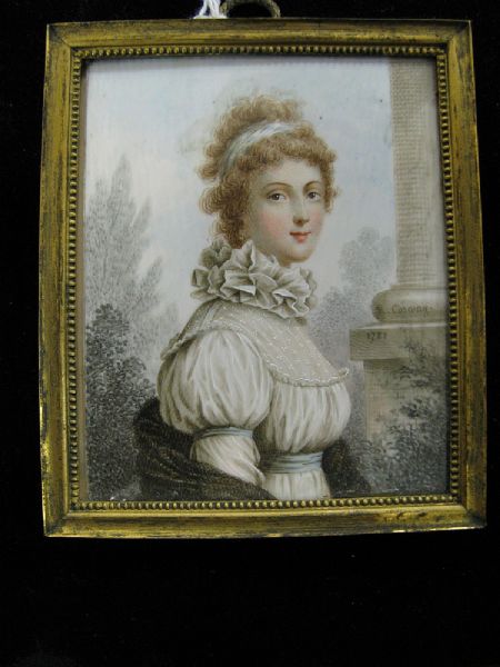 | Signed miniature portrait of Marchioness of Queenston, wearing a white dress with a" "ruffle collar, blue sash and white and blu | |