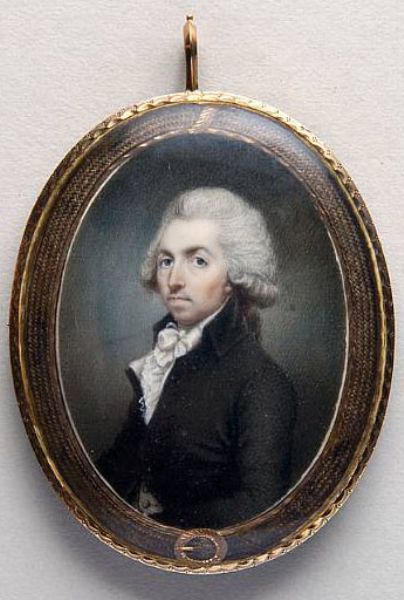 A gentleman having powdered hair and wearing a brown coat, white shirt and stock