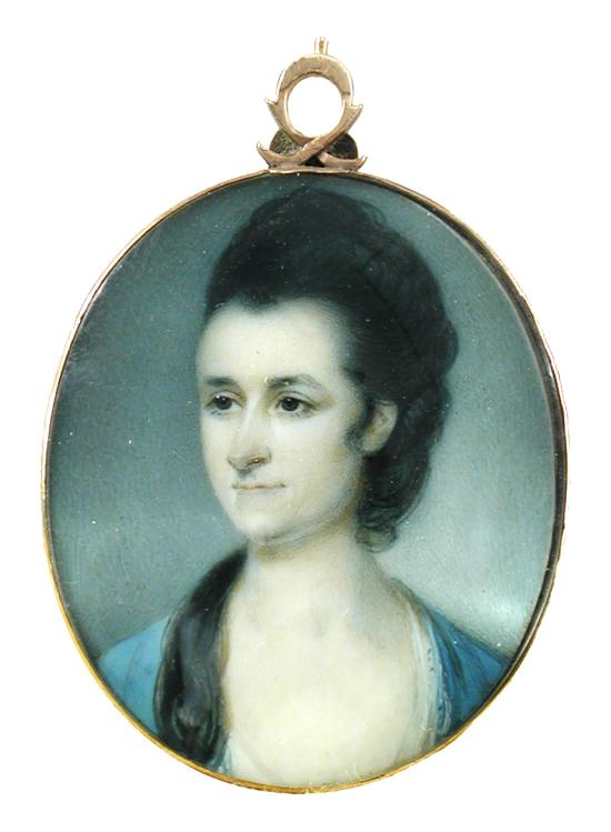 Portrait miniature on ivory of a woman with long black hair wearing a blue dress