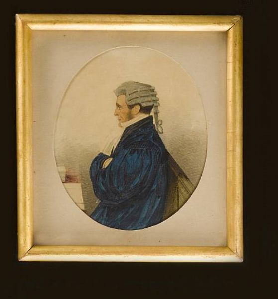 | Nathaniel Richard Clarke, seated, profile to the left, wearing blue robes with white lawn collar and wig, his arms folded. | |