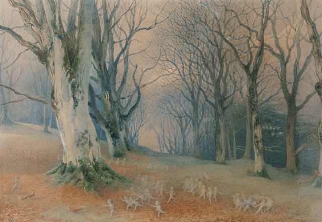 A woodland with fairies merry making with squirrels