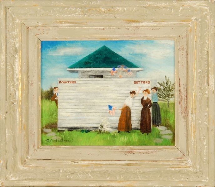 | An outbuilding with a man and three women at their respective entrances marked Pointers" and "Setters". | |