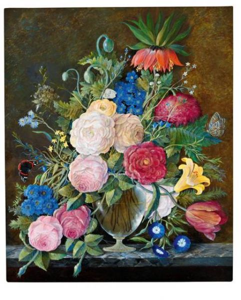 Biedermeierliches Blumenstilleben mit Insekten.