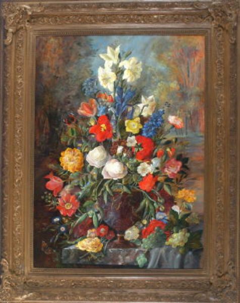 | Großer Blumenstrauß in einer Fußvase auf einem Marmorsims mit Trauben und zwei Schmetterlingen vor Landschaftshintergrund | |