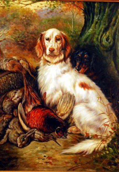 Study of two seated gun dogs and game in a wooded