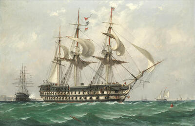 H.M.S. Nile getting underway accompanied by a salute from the flagship