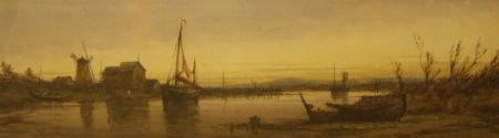 River Estuary Scene with Boats and Mill at Sunset