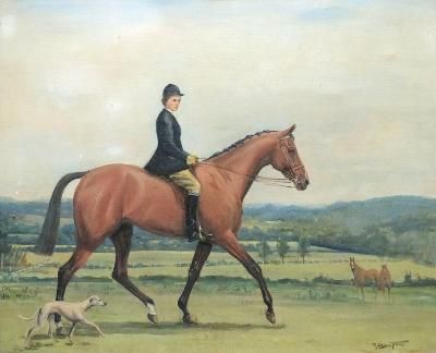 Huntswoman on a bay horse with whippet to one side