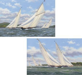 | Britannia, Cambria, Lulworth and Candida racing on the Clyde; and Endeavour and Velsheda racing off Cowes | |