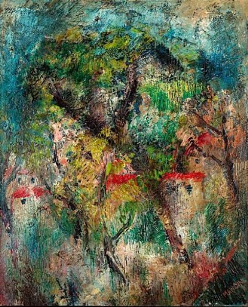 Paysage à l'arbre et maisons aux toits rouges