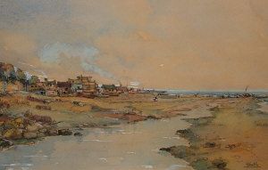 Coastal scene with figures on the beach