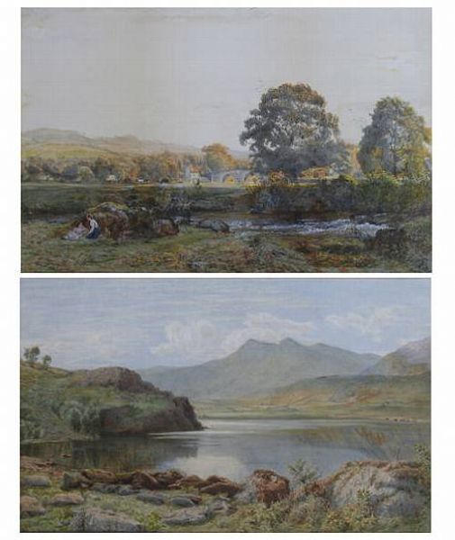 | Landscape with cattle grazing and figures by a stream, together with another of a lakeside landscape | |