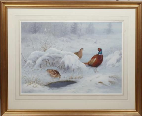 Two pheasants and a snipe in winter; ptarmigan in winter