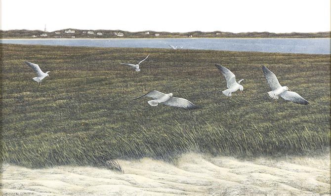 | Sea gulls circling in the foreground with the Cape Cod coastline in the background. | |
