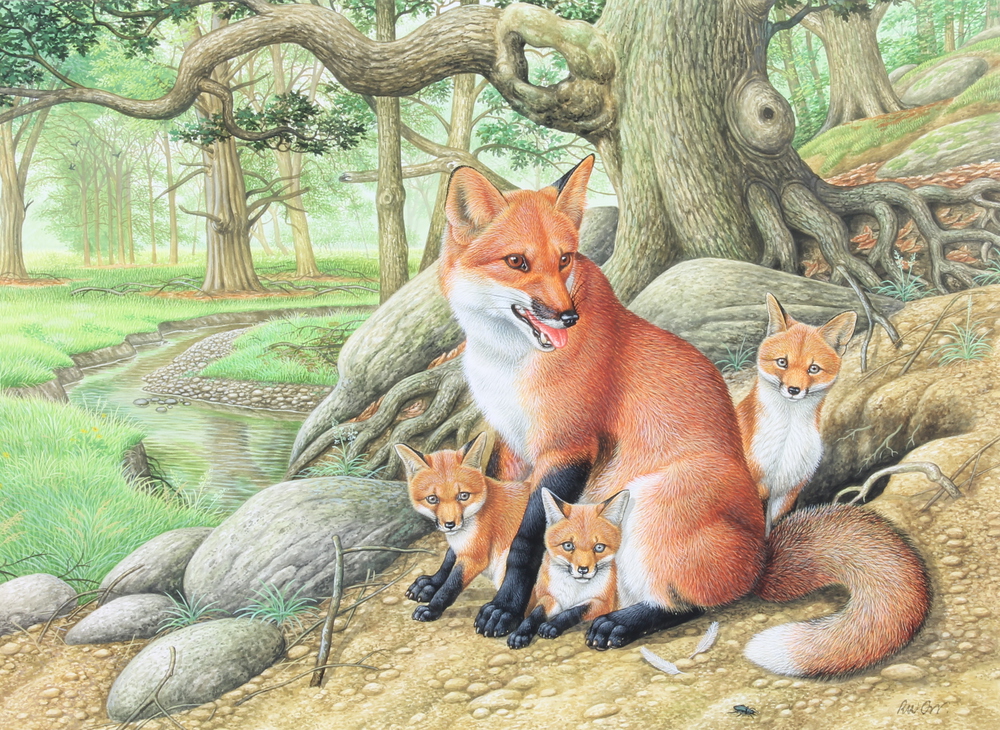 study of a family of foxes in a woodland setting