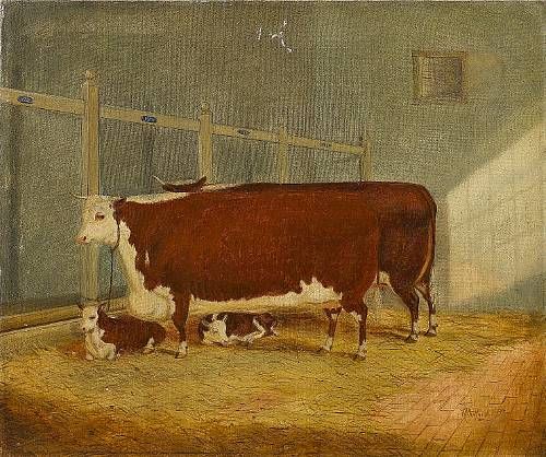Two Hereford Shorthorns and calves in a stable