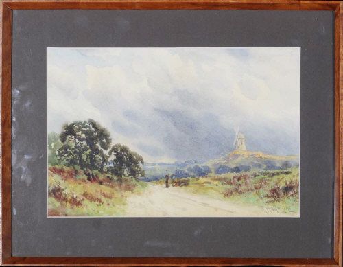 TWO WOMEN ON A COUNTRY ROAD WITH A WINDMILL IN THE DISTANCE