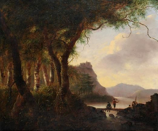 | Figures Fishing beside a Lake, a castle on a rocky promontory in the distance | |