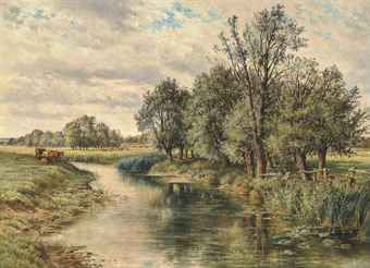 An angler on a riverbank, cattle watering beyond
