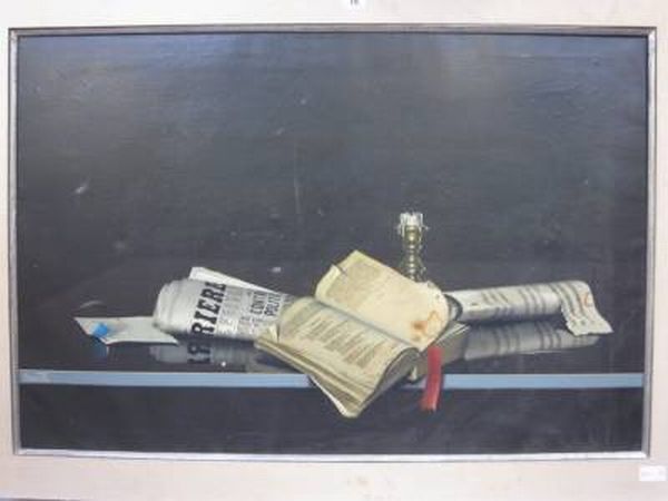 Still life with music sheet, candle, book and newspaper