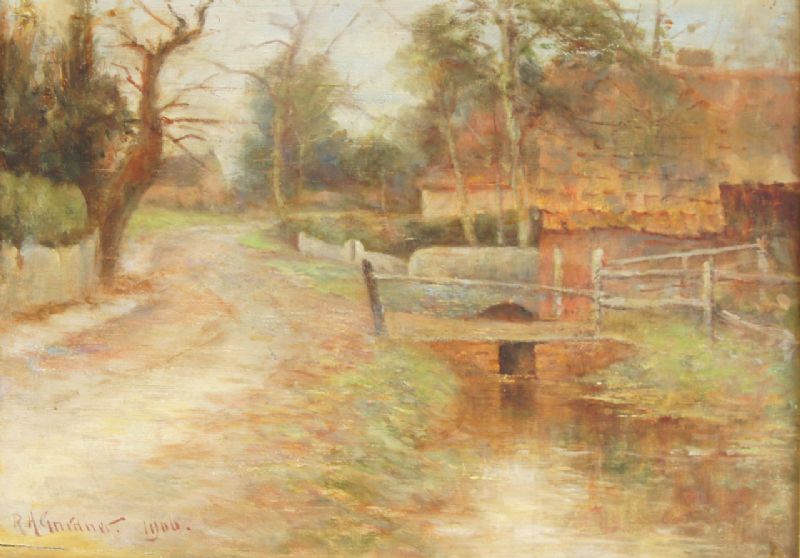Village street with a brook