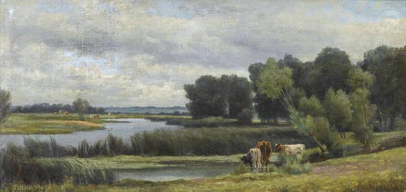 Flusslandschaft mit weidenden Kühen.