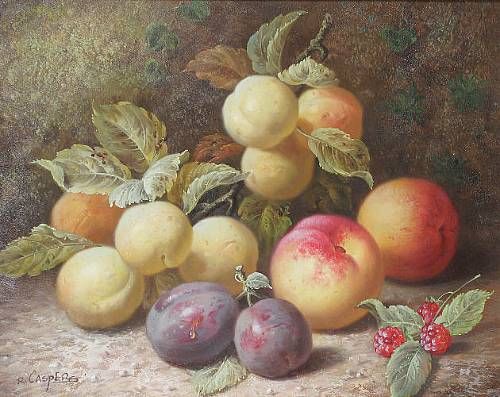 Peaches, plums, strawberries and white currants against a mossy bank
