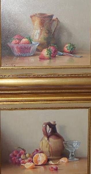| A still life with an earthenware jug and strawberries in a glass dish; A still life with an earthenware bottle, a glass, red gra | |