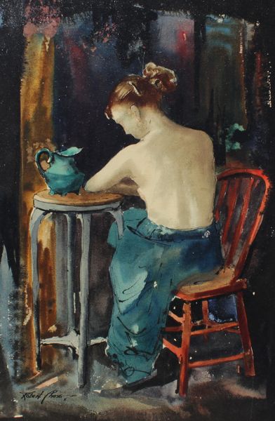 Female Seated at a Table with Her Back Turned Topless in Thought
